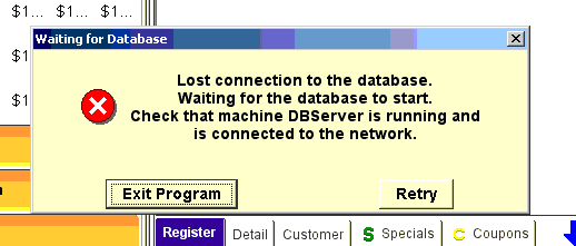 When you see the below error on your POS you’ll need to make sure the DataBase is running. The error will tell you which station your Database is located. In this example it is the DBServer but it could be any terminal.