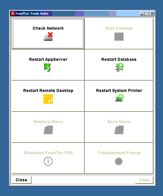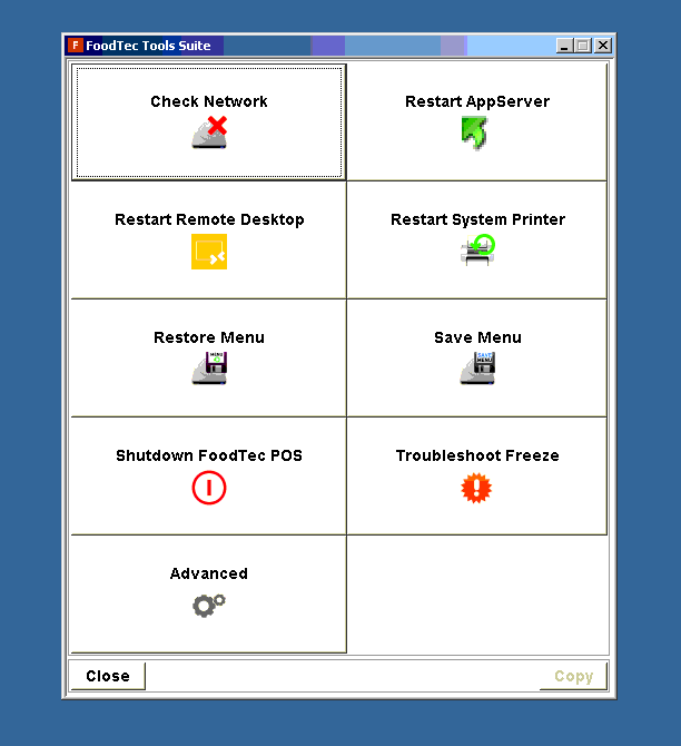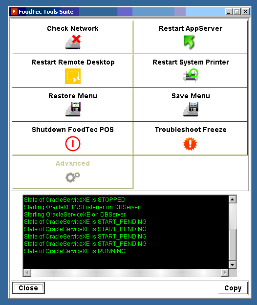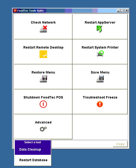 From the “FoodTec Tools Suite” window you’ll see one of these options below. “Restart Database” as located in the first image or “Advanced” and then “Restart Database” as located in the second image below.
